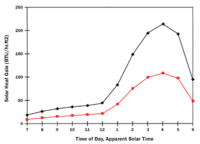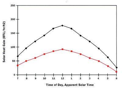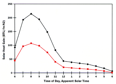 The following chart represents the solar heat gain for 1/8” clear glass (ASHRAE reference glazing) and 1/8” clear glass protected by a STORM SHIELD™ HURRICANE BARRIER. Conditions were simulated for July 21st in Miami, Florida for East, West and South facing openings.